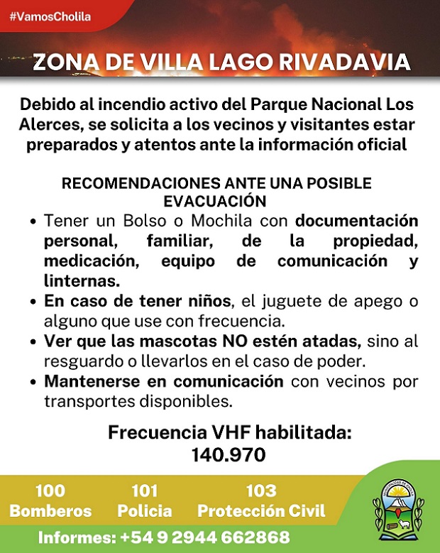 La Municipalidad de Cholila emitió un alerta preventiva dirigida a vecinos y visitantes del paraje Villa Lago Rivadavia, ante el incendio activo que se desarrolla en el Parque Nacional Los Alerces.