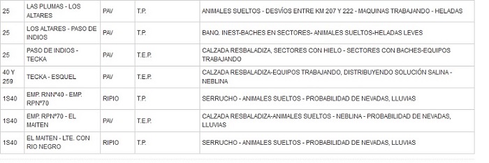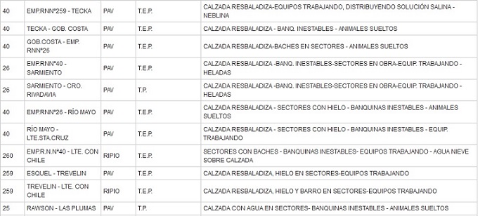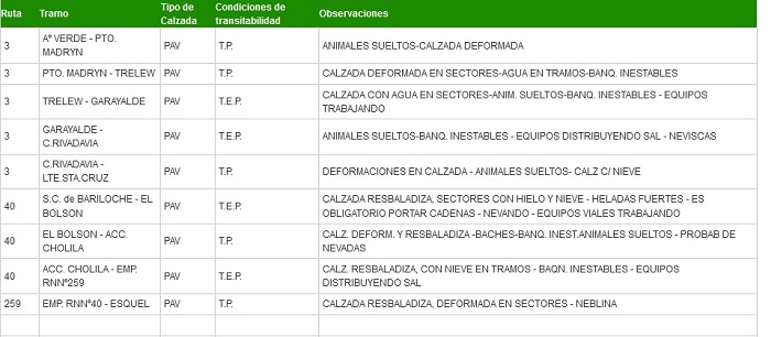 Informe sobre el estado de transitabilidad en las rutas nacionales dentro del territorio de Chubut.