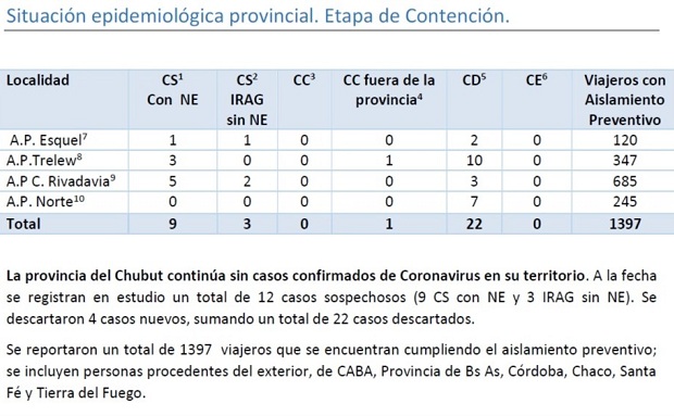 El parte actualizado de la situación epidemiológica provincial marca que no existen casos de coronavirus en Chubut. De acuerdo con los datos reportados este miércoles 1 de abril por el Ministerio de Salud, en la provincia existen 12 casos en estudio (9 con nexo epidemiológico) y 4 nuevos casos fueron descartados, sumando un total de 22.