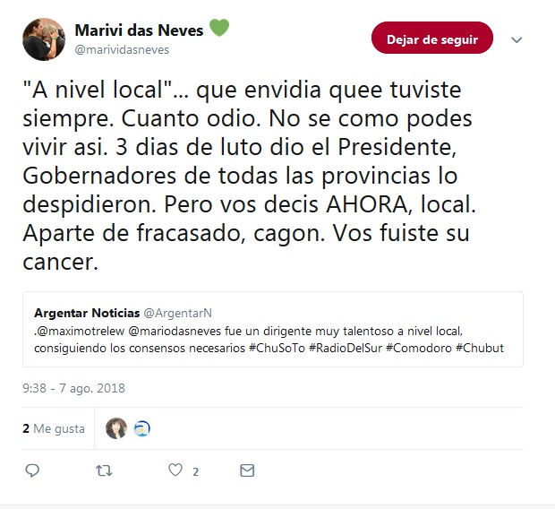 En la previa de la definición por la presidencia de «Chubut Somos Todos», Mariví se despachó por twitter contra Máximo Pérez Catán, fue luego de que el exintendente de Trelew, en una entrevista radial, sostuviera que “la familia Das Neves tiene fuerza y presencia en el partido” esto cayó muy mal a María Victoria, que una vez más se expresó vía twitter. En otro tramo de la entrevista Pérez Catán definió a Das Neves como un referente importante a nivel “local”. A lo que Mariví replicó con dureza acusándolo de «tipo mentiroso» además de “fracasado y cagón”.