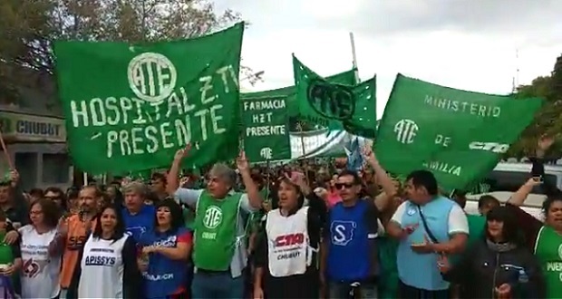 Empleados y gremios estatales se movilizan en Rawson en el marco del paro de actividades convocado por los gremios que representan a los empleados públicos. Reclaman el cese del pago escalonado de sueldos, la apertura de paritarias y la derogación de los decretos de ajuste