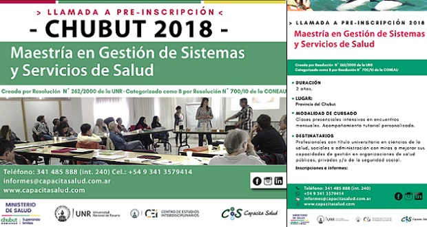 El Ministerio de Salud del Chubut, a través de la Dirección Provincial de Formación y Capacitación de Recursos Humanos, informa que se encuentra evaluando la posibilidad de organizar en la provincia una cohorte de la “Maestría en Gestión de Sistemas y Servicios de Salud”, que dicta la Universidad Nacional de Rosario (UNR) y está acreditada por la Comisión Nacional de Evaluación y Acreditación Universitaria (CONEAU), que depende del Ministerio de Educación de la Nación.
