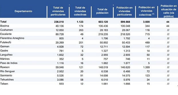 La población total de Chubut es de 603.120 habitantes, según indicaron los datos provisionales del Censo Nacional de Población, Hogares y Viviendas 2022 que se realizó el Instituto Nacional de Estadística y Censos (Indec) en 2022.