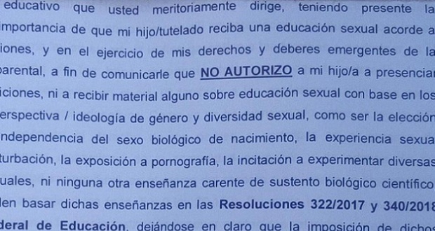 El padre de un estudiante del antiguo Colegio Perito Moreno, actual Escuela 766, presentó ayer ante la directora de ese establecimiento secundario un documento para prohibirle a la institución que su hijo “presencie clases y/o exposiciones, o reciba material alguno sobre educación sexual con base en los principios de perspectiva / ideología de género y diversidad sexual, como ser la elección de género con independencia del sexo biológico de nacimiento, la experiencia sexual temprana, la masturbación, la exposición a pornografía, la incitación a experimentar diversas orientaciones sexuales, ni ninguna otra enseñanza carente de sustento biológico científico”.