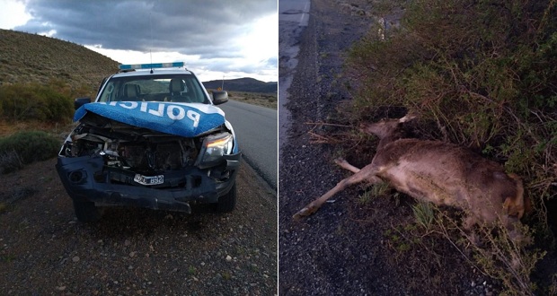 El vehículo policial se trasladaba a Esquel para realizar un service y reparaciones cuando un ciervo se cruzó en la ruta y provocó el choque, lo que causó daños en la parte delantera del vehículo marca Ford Ranger.