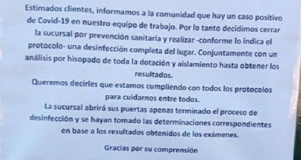 De manera preventiva, la empresa indicó que «por prevención sanitaria» cerró este viernes la sucursal para la desinfección y la realización de los hisopados a todo el personal que de desempeña allí.
