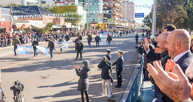 Puerto Madryn celebró este miércoles el 212º aniversario de la Revolución de Mayo con un multitudinario acto, el cual contó con el desfile de cerca de cien instituciones locales.
