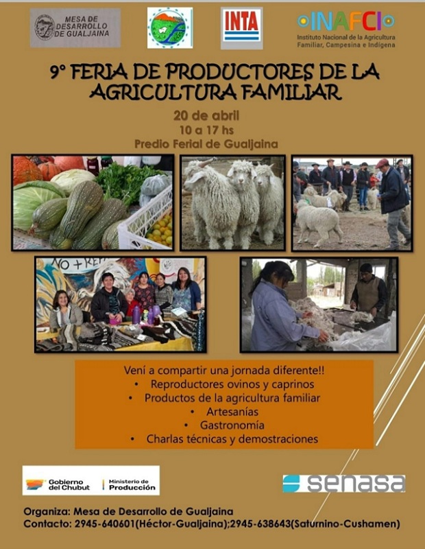El próximo sábado 20 de abril, de 10 a 17 horas, se realizará con la presencia de artesanos, emprendedores, productores, tejedoras, chiveros y criadores de conejos, ovinos, y chacareros, la 9na Feria de productores de la Agricultura Familiar en el predio ferial de Gualjaina.