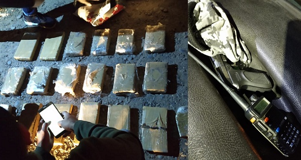Personal de seguridad pudo constatar que dentro del vehículo detenido había un arma de fuego, equipo de Comunicaciones, chalecos y gorras de policía, y 17 kilos de marihuana.